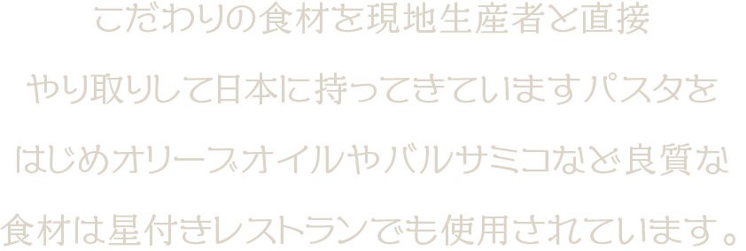 こだわりの食材を現地生産者と直接やり取りして日本に持ってきています。パスタをはじめオリーブオイルやバルサミコなど良質な食材は星付きレストランでも使用されています。